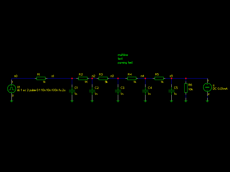 * simulation de RC2 .control tran 10n 10000n write .endc * Spice netlister for gnetlist R5 n4 n5 1k V1 n0 0 dc 1 ac 2 pulse 0 1 10n 10n 100n 1u 2u R4 n3 n4 1k R3 n2 n3 5k C5 n5 0 1n R2 n1 n2 1K C4 n4 0 1n R1 n0 n1 1k C3 n3 0 1n C2 n2 0 1n C1 n1 0 1n I1 n5 0 DC 0.01mA R6 0 n5 10k .END
